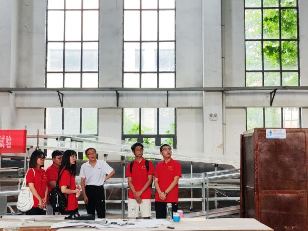 水工实验厅中,成员们遇到了正在进行模拟试验的罗教授一行人,罗教授介绍道,他们正在进行的是九峰山抽水蓄能站工程上水库导水洞水工模型试验,通过模型试验的方法,为工程建设寻求最优的建造方案。