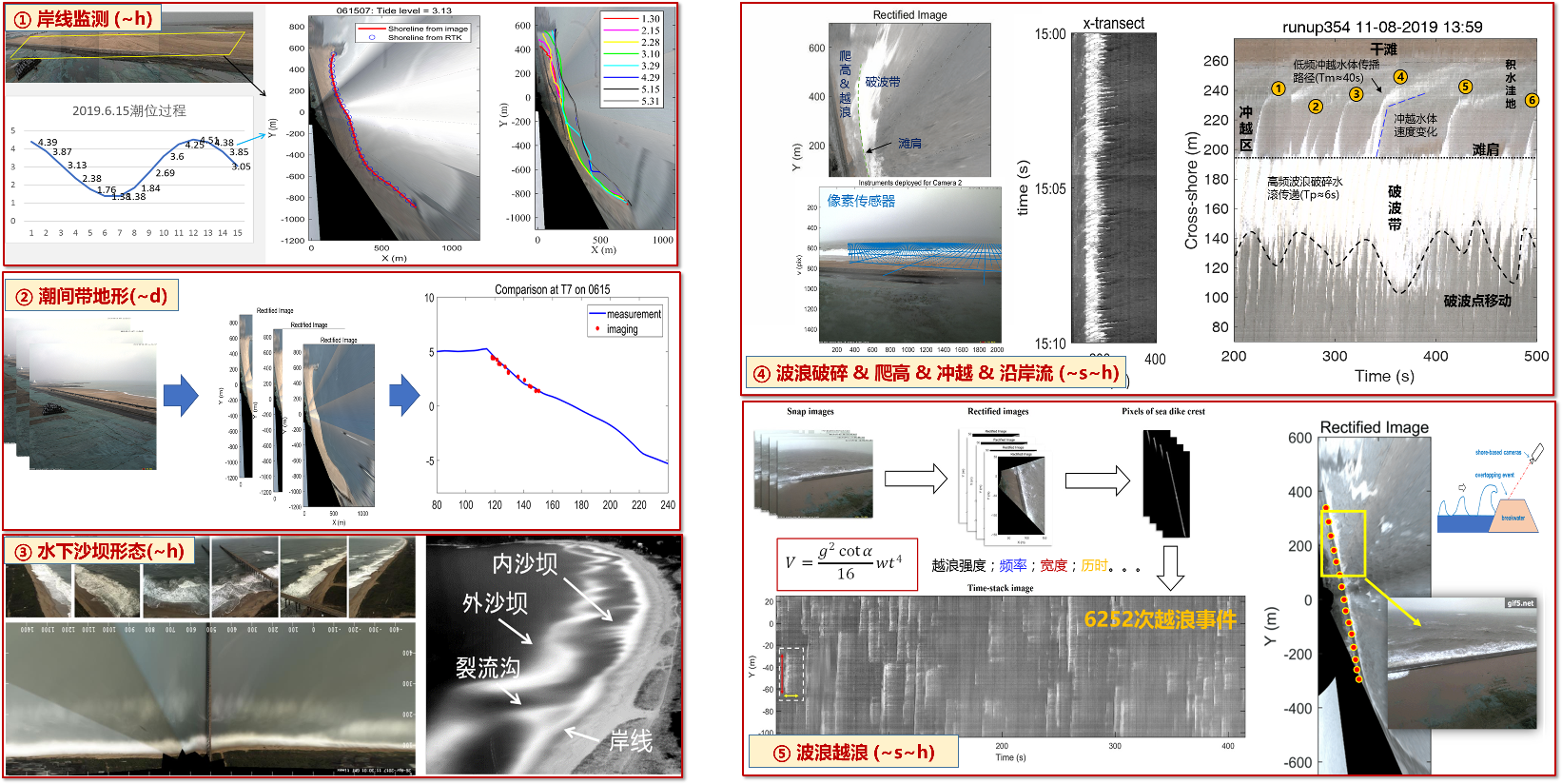 河海大学自主研发了新型海岸带岸基数字影像监测系统(COSVIMS),基于数字视频监控技术、影像分析技术和信号处理技术,以指定的时间表和2Hz以上的采样率,对空间范围1km以上的岸滩区域进行实时连续的数字影像和光学传感数据采集,可实时定量解析岸线位置、潮间带地形、沙坝形态、波浪破碎爬高越浪、水深反演、植被分布、人类活动轨迹等数据,空间分辨率可达cm~m,时间分辨率可达s~hr,实现了全天候、长期、连续、实时的海岸动力地貌和环境数据的准确监测。