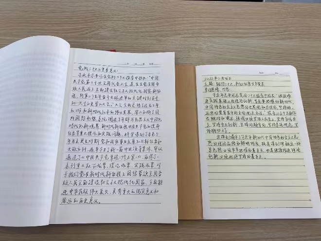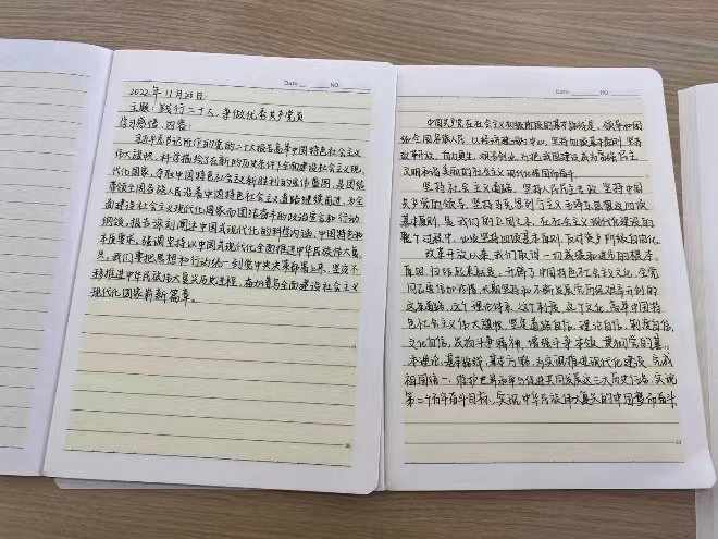 金神赌场 研究生学硕三支部围绕“践行党的二十大、争做优秀共产党员”主题,以给每位党员建立“学习档案”的形式开展主题党日活动,在每一次学习活动中,党员在自己的学习记录本上进行记录与总结,并定期分享展示优秀学习笔记。在学习中结合党的二十大精神切实反思自身实际起到党员先锋模范作用的工作经历与弘扬水利精神下的科研担当,坚持和发扬理论联系实际的优良学风。
