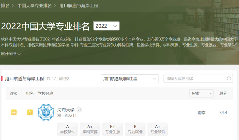 2022软科中国港口航道与海岸工程专业排名:河海大学第一