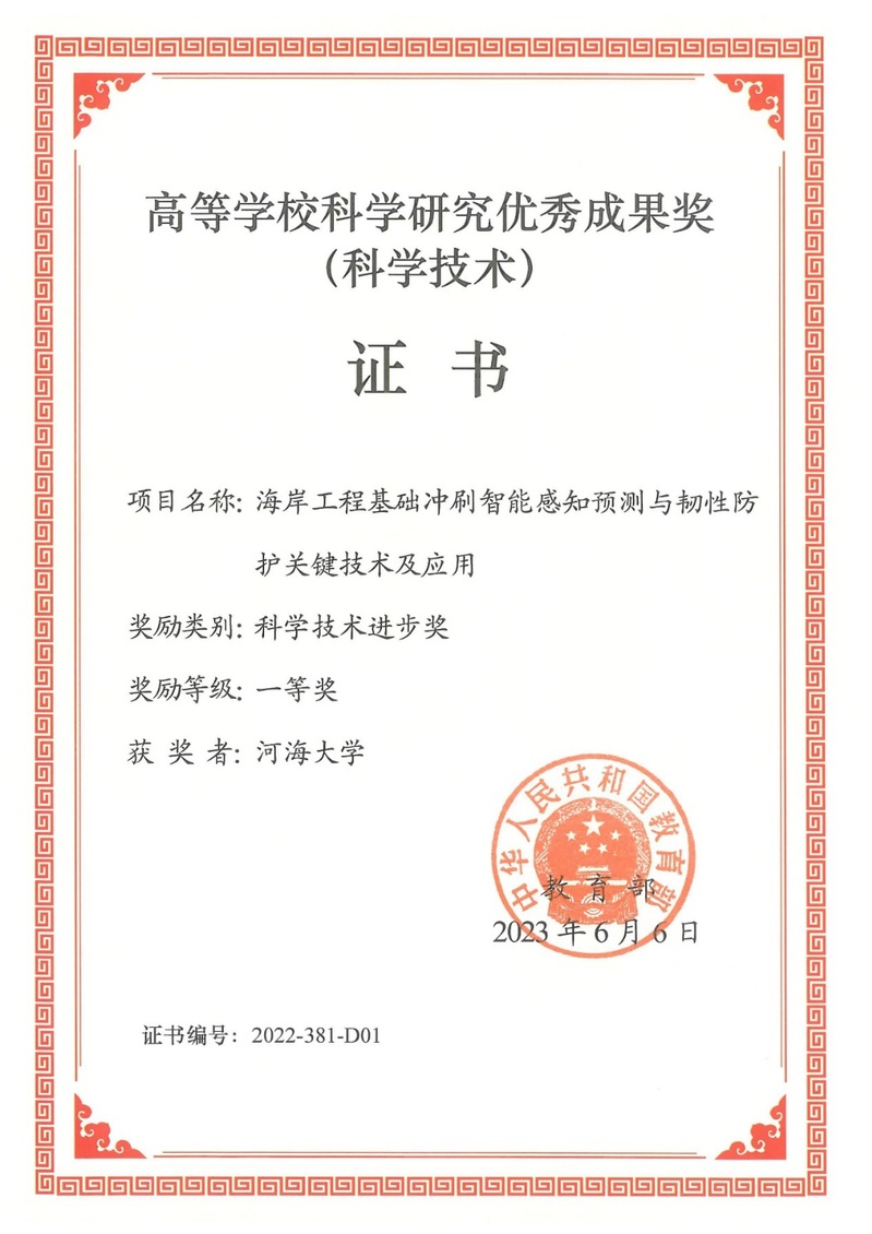研究工作获2022年教育部科技进步奖一等奖,被国家自然科学基金委、交通运输部等单位组织的专家鉴定为“国际领先水平”或验收评价为“取得突出成果”。成果应用于全球规模最大跨海工程港珠澳大桥、浙江海塘安澜千亿工程、渤海湾千亿方气田开发海底管线工程、非洲大西洋沿岸枢纽Abidjan港、日本最大商业规模化Kashima海上风电工程等11个国家和地区的40余项重要海岸工程建设和运维中,支撑2项大型海外工程获得中国建设工程“鲁班奖”。