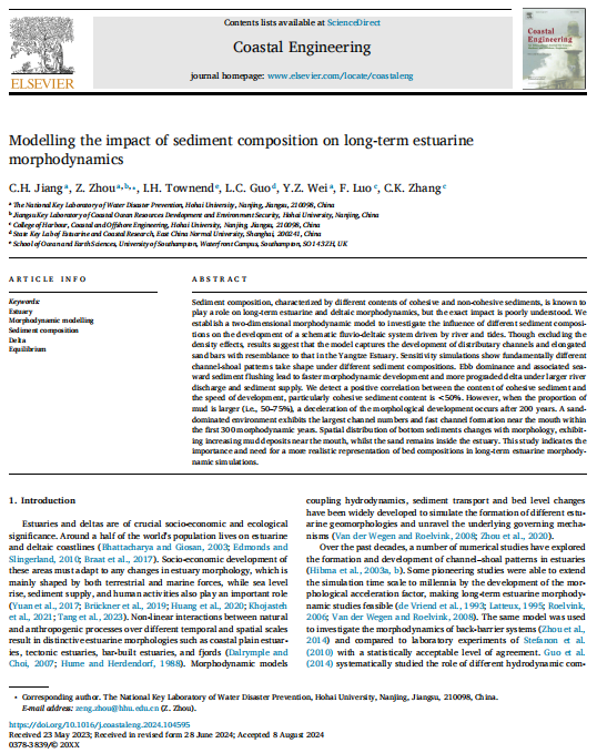 近日,Coastal Engineering期刊刊发了来自金神赌场-金神娱乐 的最新研究成果“Modelling the impact of sediment composition on long-term estuarine morphodynamics”(泥沙组分对长周期河口动力地貌影响的数值模拟研究),该成果的第一作者为金神赌场 张长宽教授指导的博士生蒋春海,论文其他合作者包括金神赌场 周曾教授、罗锋副教授、韦以璋博士生、英国南安普顿大学Ian Townend院士和华东师范大学郭磊城研究员。