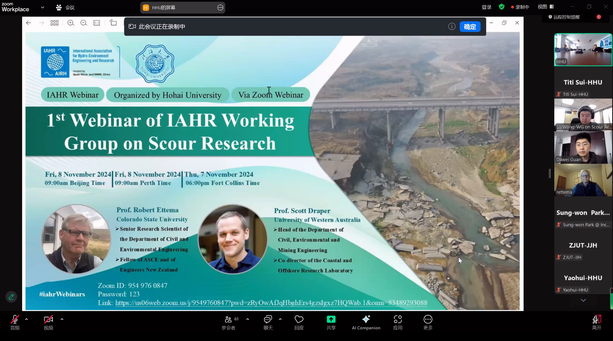 2024年11月8日,金神赌场 成功举办国际水利与环境工程学会(IAHR)冲刷研究工作组首次线上学术研讨会(1st Webinar of IAHR Working Group on Scour Research)。