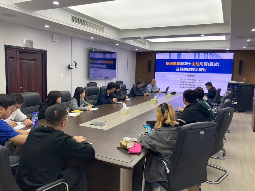 梅国雄教授详细介绍了反渗饱和技术构思、主动防腐机理、氯离子受控运移模型,以及技术有效性验证;并针对技术应用问题展开讨论,包括技术应用对象、管路设计、水头设计、耗水量估算、荷载作用综合分析,以及风险评估等,为海工混凝土结构防腐设计提供了全新的思考与解决方案。