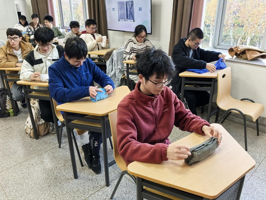 关于行李箱收纳的技巧,收纳师介绍了填平凹槽、分面分层的原则,带领同学们现场练习了衣服折叠与行李箱收纳的方法。