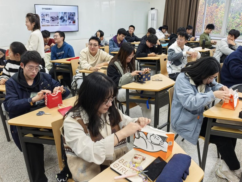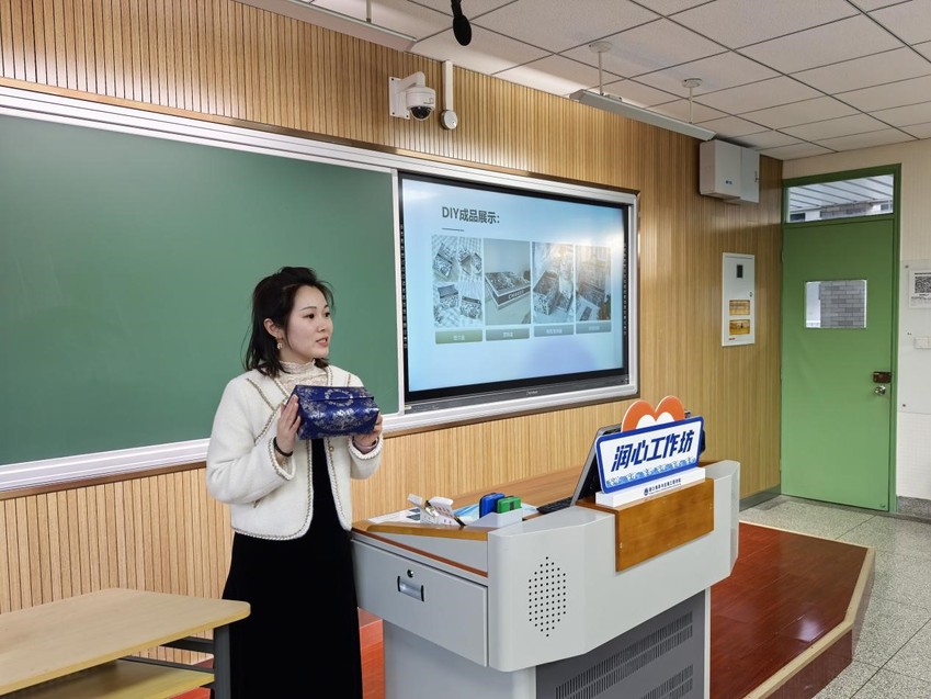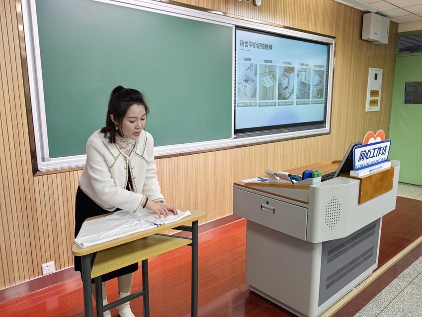 接着,收纳师为同学们讲解了利用生活杂物进行DIY创意收纳的方法。同学们根据步骤裁剪折叠,将手提袋变废为宝成为纸巾盒、收纳盒。最后,收纳师为同学们推荐了网格收纳架、床边置物篮、窄边小推车等在宿舍中常用的收纳好物。
