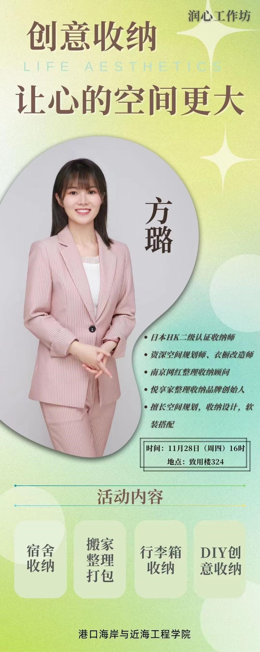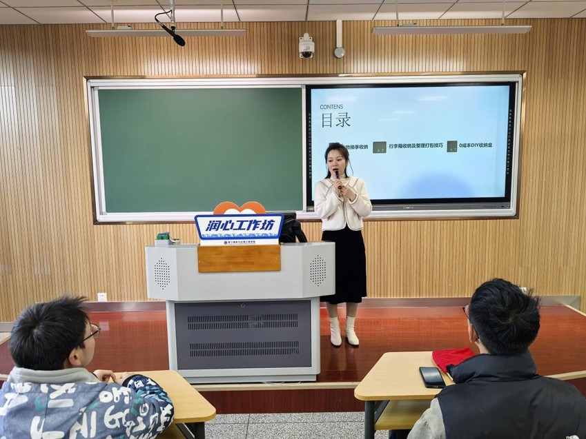 11月28日,金神赌场 在江宁校区举行“润心工作坊”第2期——“创意收纳,让心的空间更大”宿舍整理收纳培训活动,邀请收纳师方璐为同学讲解了宿舍收纳、行李箱收纳、搬家整理打包、DIY创意收纳等收纳技巧。活动由2024级辅导员林晨主持,2022级、2024级宿舍代表参加。