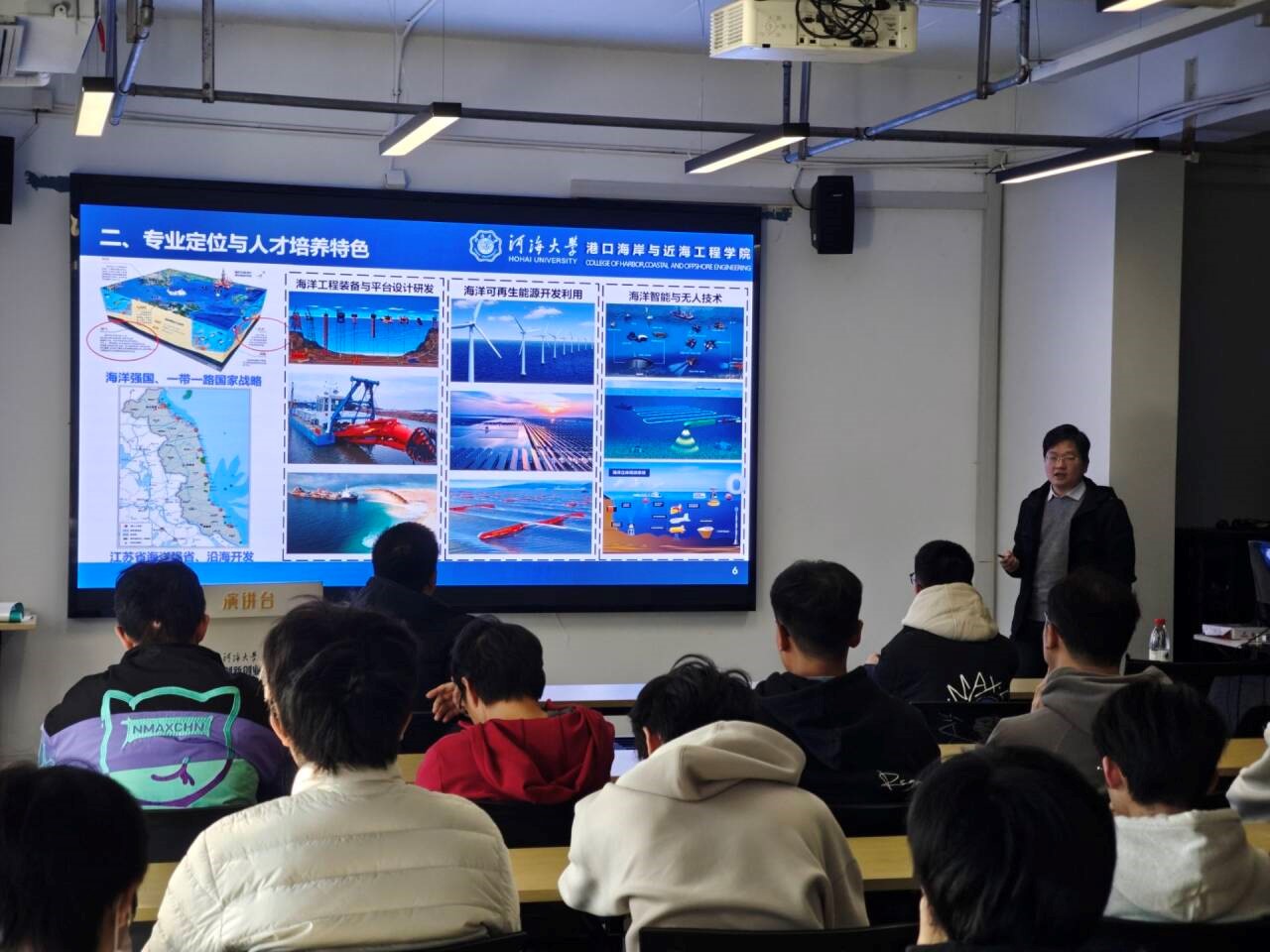 汤冬老师首先为2024级船海专业的同学们讲解了船舶与海洋工程领域的全面概览,包括专业与行业概况、科研院所分布以及行业发展趋势等情况。他详细介绍了船舶工程与海洋工程的细分领域,并探讨了半潜式平台、海上平台、人工岛等关键技术的发展。