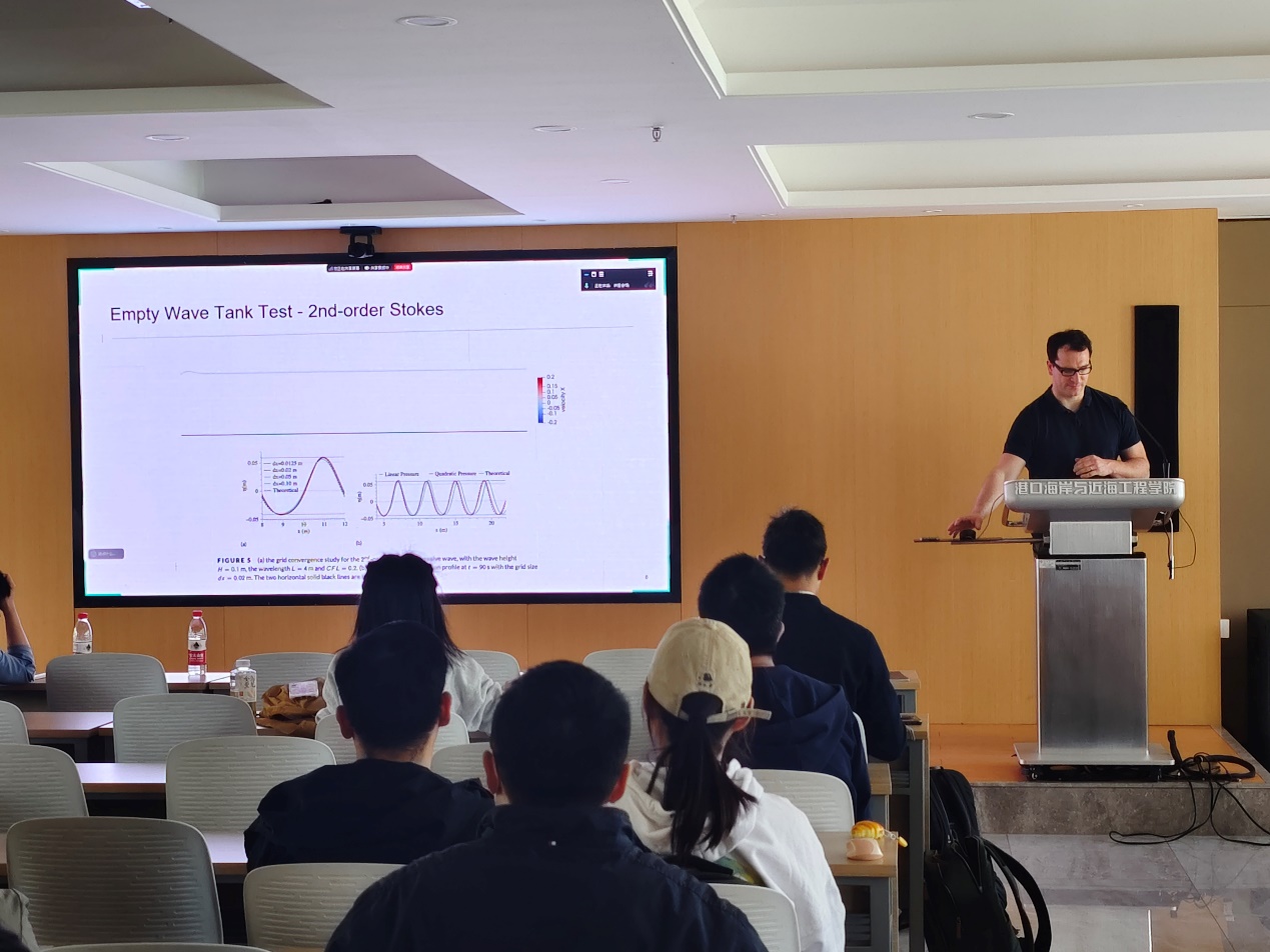 Hans Bihs教授以“REEF3D: An Open-Source Tool for Coastal Hydrodynamics”为题,详细介绍了开源流体动力学模拟软件REEF3D在海岸、海洋与水利工程中的先进应用,展示了REEF3D在波浪-结构物相互作用、浮体响应及泥沙输运模拟等方面的强大功能,并分享了其在欧洲ERC Consolidator Grant项目中的研究部署与成果。