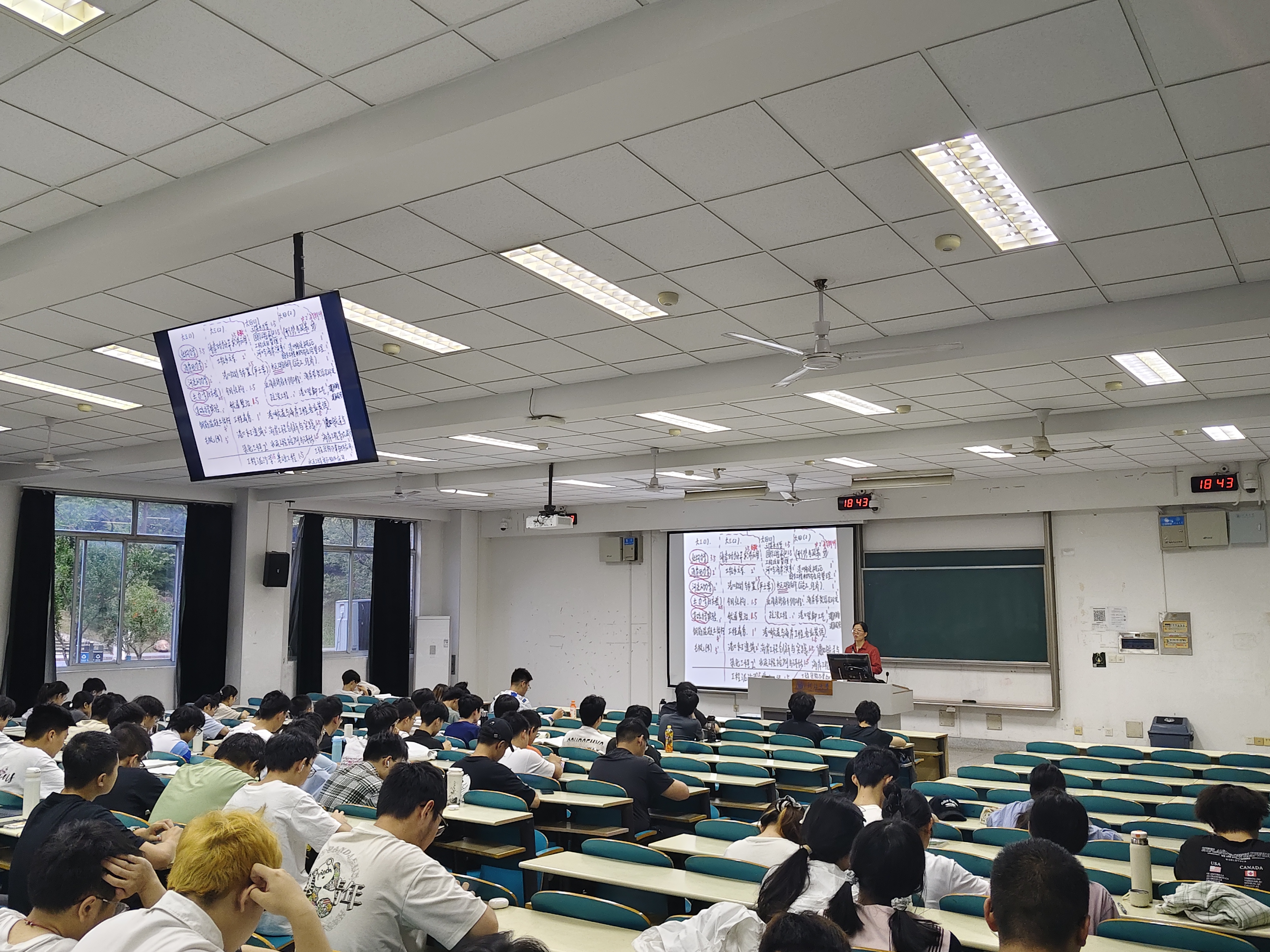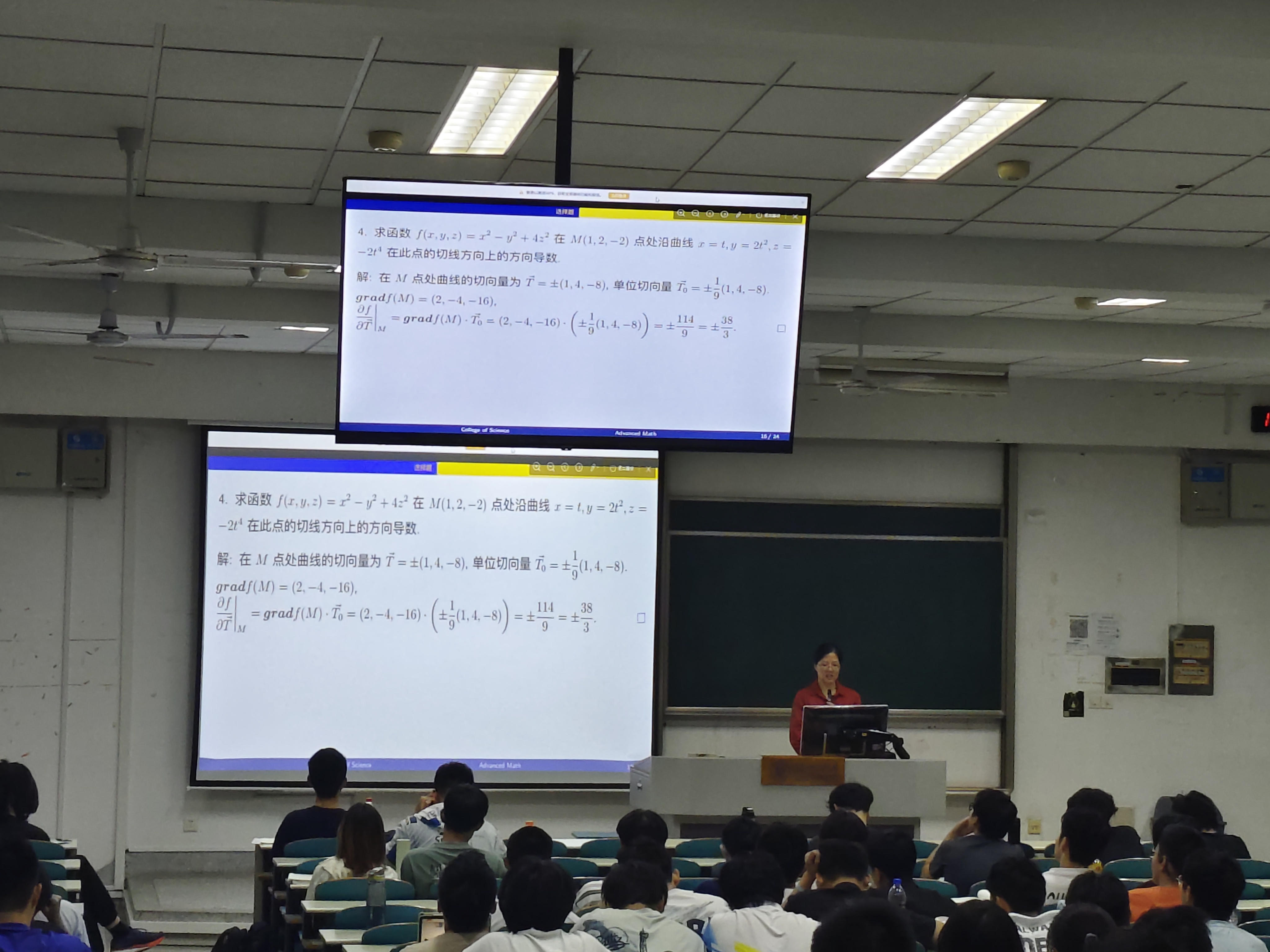 接着,蒋老师为大家讲解本次期中考试的试题,分析每一道考题的知识点、考察方式、得分点和失分点。她指出,积分与微分是重点考察内容,特别是多元微分、偏微分和重积分,需要同学们多加练习。同时,蒋老师联系考题与课本例题,分析了两者的相似之处,为大家找出考察的重点知识。对于简答题部分,蒋老师强调公式、计算、书写、答题完整度和一题多解等应试要点,需要同学们在平时养成良好的做题习惯,保证“会的题拿满分,不会的题拿步骤分”。
