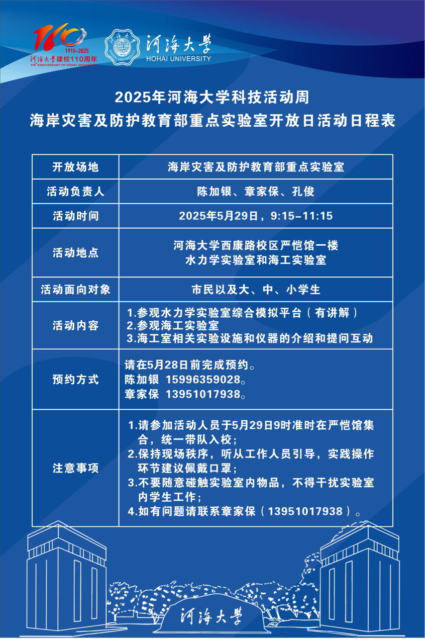 2025年河海大学科技活动周 海岸灾害及防护教育部重点实验室开放日活动日程表