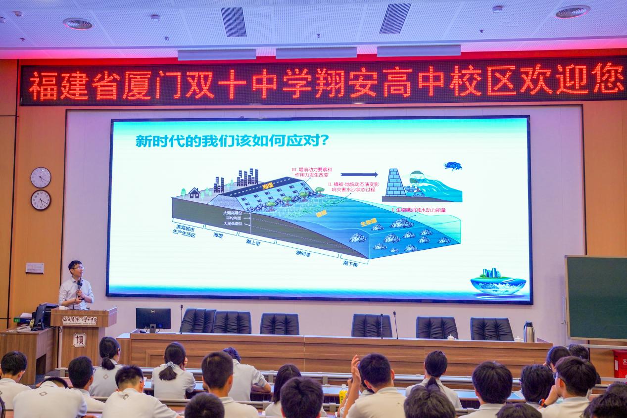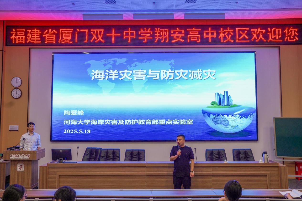 5月18日下午,河海大学海岸灾害及防护教育部重点实验室副主任陶爱峰教授应邀来到厦门双十中学翔安高中校区,以“海洋灾害与防灾减灾”为题为同学们带来了一场别开生面的科普讲座。讲座主要介绍了海岸灾害的不同类型及我们应对灾害的防灾减灾手段,展现了自然伟力与人类智慧之间的张力,引发了同学们关于人与自然关系问题的新思考。