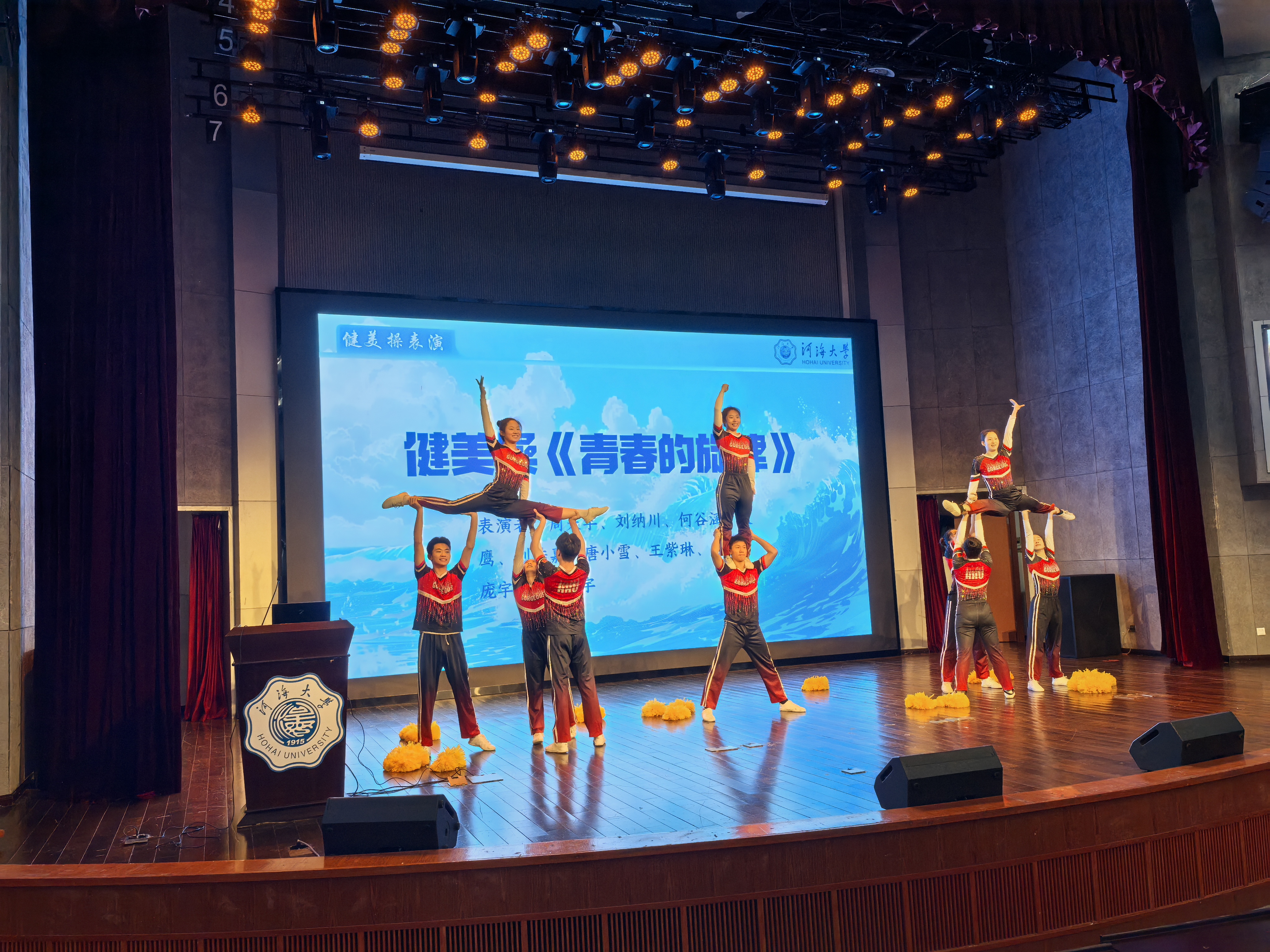 随后,研学团观看了河海大学啦啦操队带来的《河海力量、足球之光》。他们以矫健的身姿、超强的力量和精湛的技艺,为观众带来一连串令人惊叹的高难度动作。河海大学啦啦操队创建于2003年。这是一支曾站在世界冠军领奖台上的队伍,他们不仅仅是河海大学的骄傲,更是江苏啦啦操运动蓬勃发展的生动写照。
