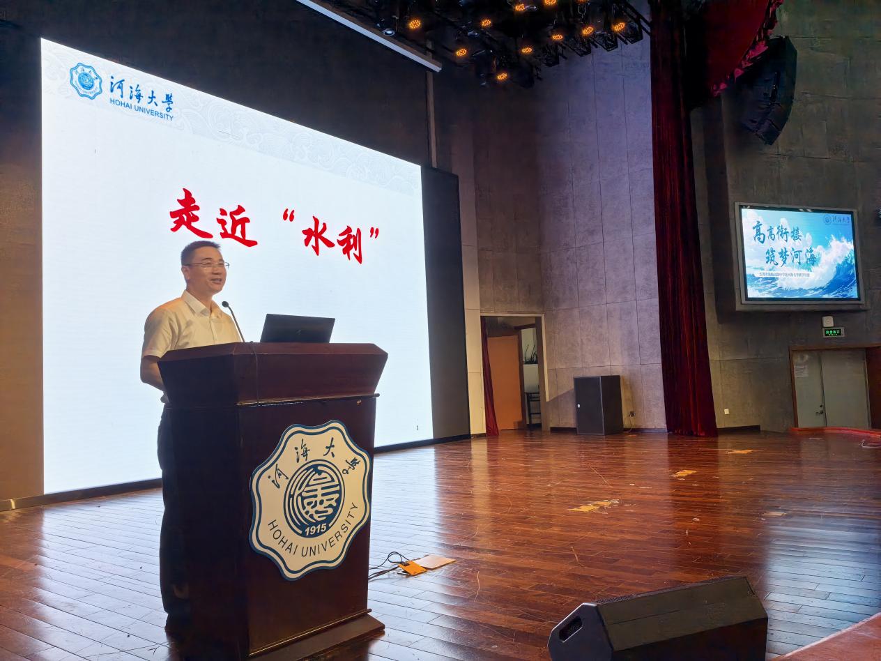 龚政院长为研学团讲授了题为《走近“水利”》的讲座。龚院长以连云港地区的地理环境入手,为同学们深入浅出地讲解了我国的地理特点和发展需要,梳理了我国的流域特点及调配工程,分析了水电开发现状及未来发展趋势,讲解了三峡大坝等著名水利枢纽的内部结构、价值意义,阐述了航运在“一带一路”倡议背景下的优势特点、船舶行业发展趋势、长江口深水航道整治工程的经济民生效益、我国港口建设情况,通过视频与图文具体介绍了洋山深水港、港珠澳大桥、深中通道等国之重器,带领同学们生动感受到水利工程的魅力和河海大学的办学内涵与学科优势。