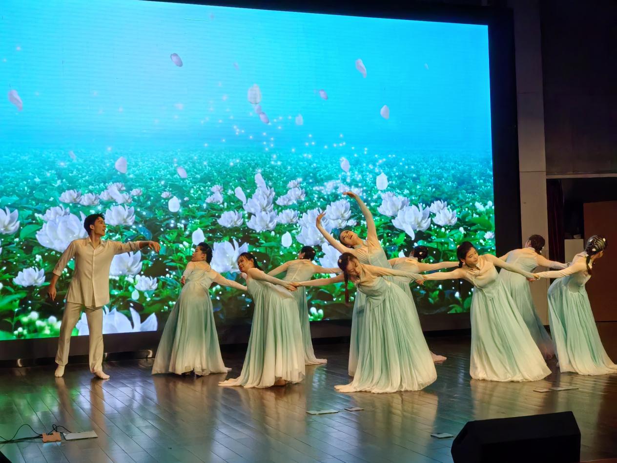 首先,研学团欣赏了由河海大学大学生艺术团表演的舞蹈《茉莉吟》。他们的青春正如茉莉花一般,纯洁而充满活力,在这片热土上绽放,带领着同学们随着舞者轻盈的舞步,重温这片充满诗意的江南水乡。河海大学大学生艺术团是校内综合性艺术组织,包含多个艺术方面,多次在比赛中获得好成绩,其中舞蹈团更是作为省级艺术团,在大艺展中荣获一等奖。