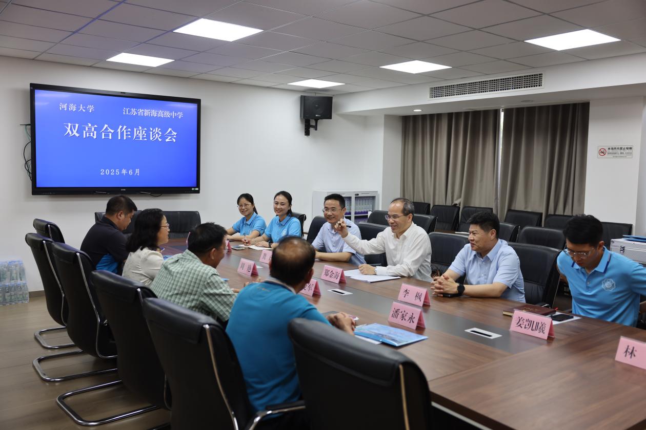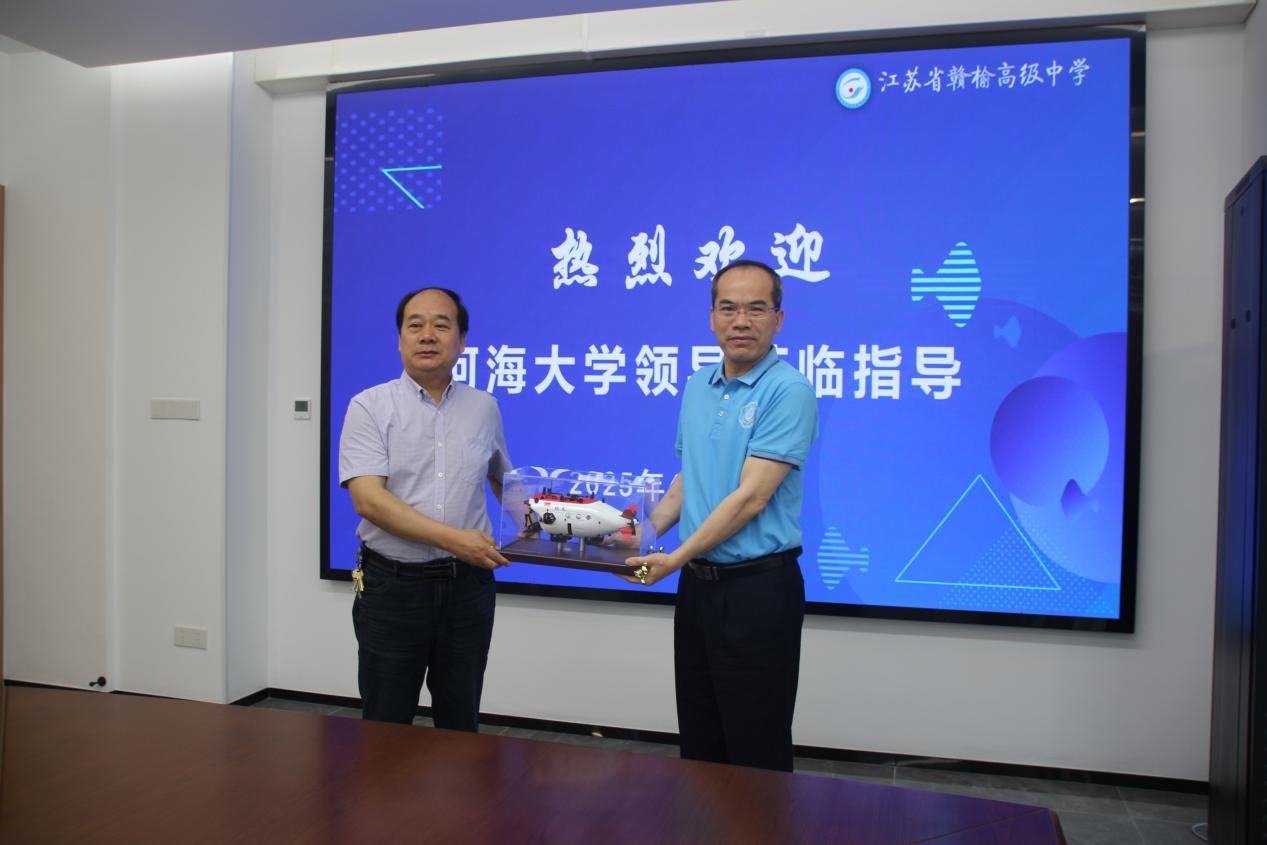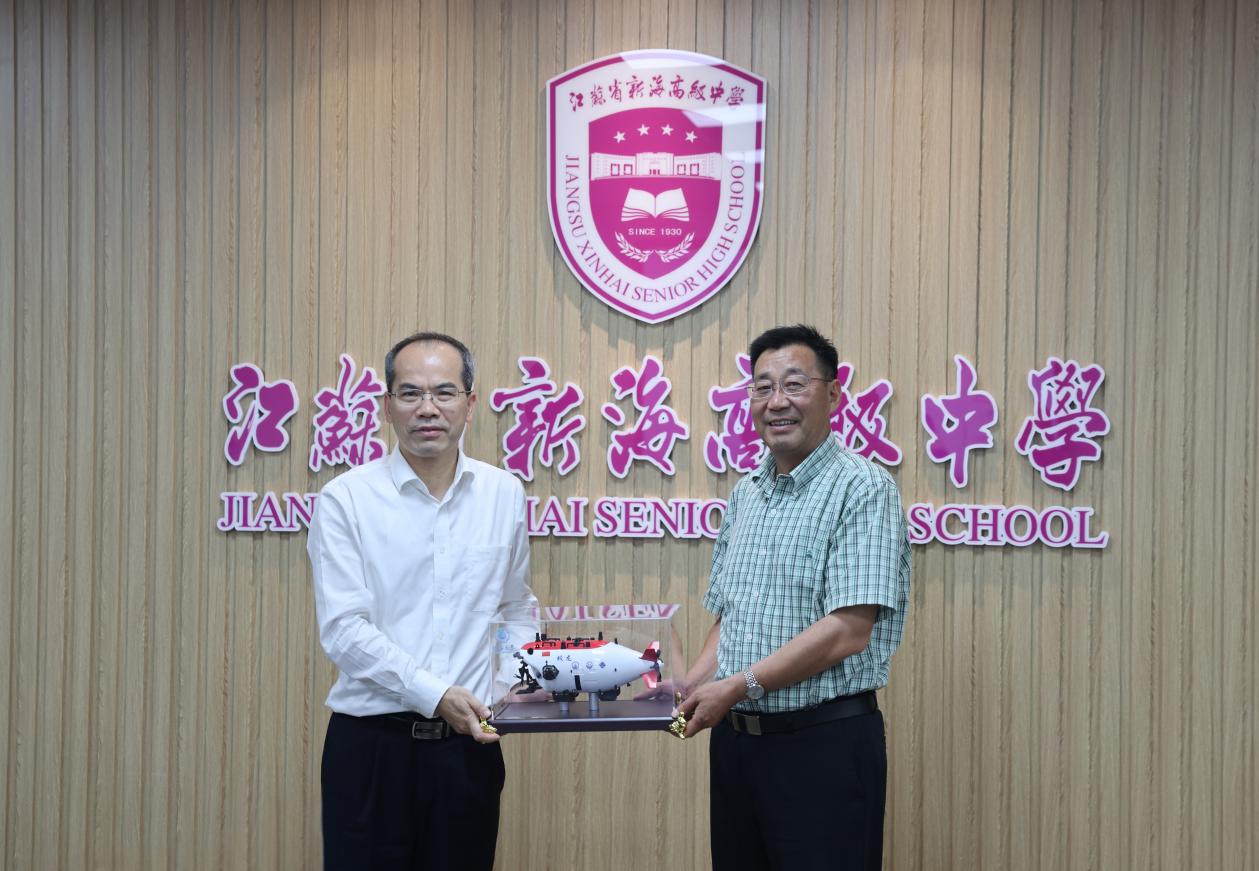 在与江苏省新海高级中学、江苏省赣榆高级中学的座谈会上,郑金海校长代表河海大学向长期以来为河海输送了大批优秀生源的中学表示感谢。郑校长指出,河海大学能为同学们提供对接国家战略的科教平台与个性化成长的“黄金通道”,选择河海是成就学生、荣耀母校、服务港城的“共赢之举”,期待与中学携手共建,建立“大中衔接、共育英才”的长效机制。双方就竞赛指导、科普宣传、生涯规划指导、校本课程建设等双高长效合作机制进行了深入讨论。郑校长为中学赠予蛟龙号载人潜水器模型。