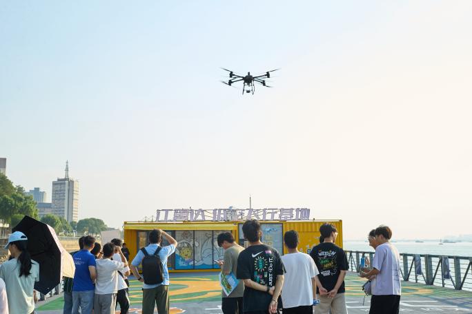 接着,师生一行来到了下关地区长江边南京港,在这里观看了长江汇科技有限公司的江翼达·低空飞行基地。在这里,飞行员操纵直升机,向师生展示了利用无人机向在长江航行中的货轮递送物资和外卖的过程。同学们对此过程表示惊奇,迫切向科技负责人询问其设计原理。负责人从机型的外观设计,承载的重量,以及无人机、货轮之间运动速度的匹配等方面为大家解答,让同学们对于科技赋能的强大力量再次有了实感。