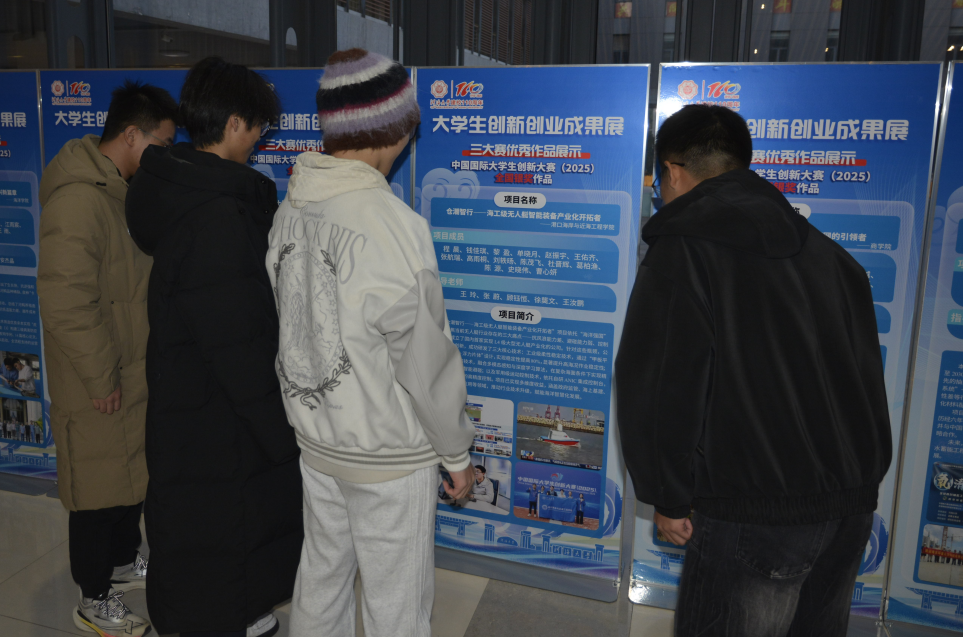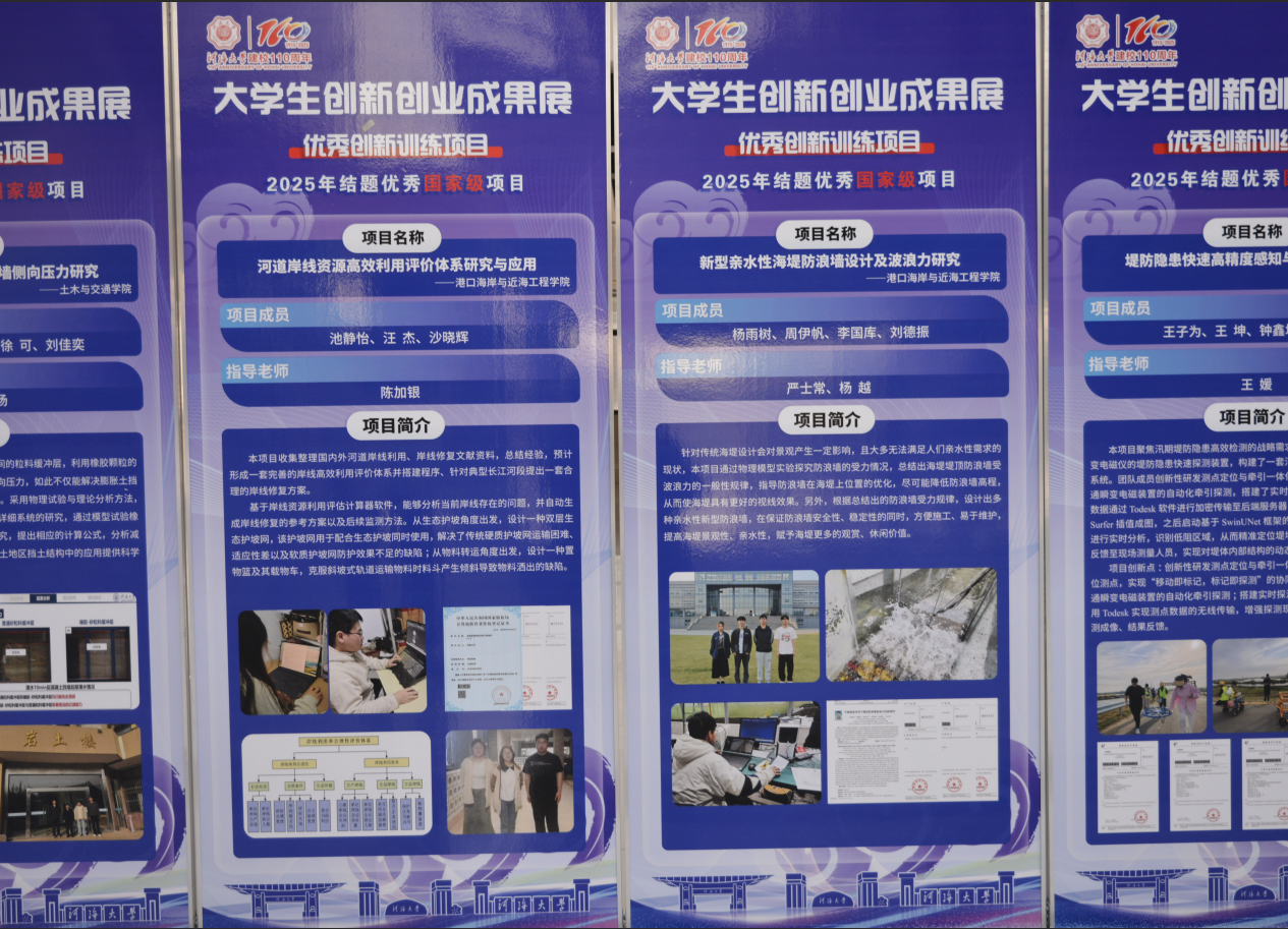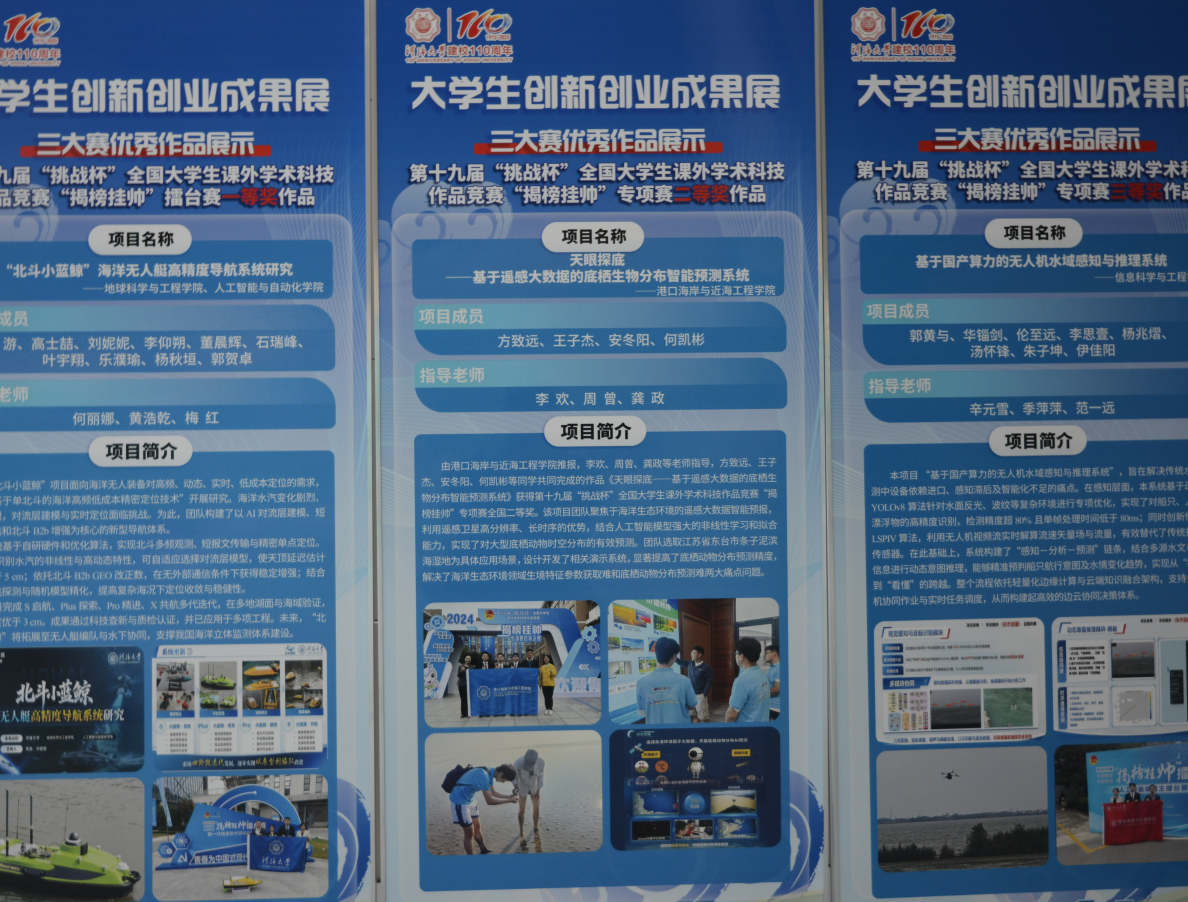 在创新创业成果展现场,金神赌场 设置专门展区,重点展示国家级竞赛获奖作品及优秀创新训练项目。“三大赛”展区中:《深海哨兵——海上风机多点位冲深智能预警预报系统》获第十九届“挑战杯”全国大学生课外学术科技作品竞赛“揭榜挂帅”擂台赛擂主、特等奖;《天眼探底——基于遥感大数据的底栖生物分布智能预测系统》获赛事“揭榜挂帅”专项赛全国二等奖,《智慧粒子海工冲刷预警预报系统》获该竞赛全国三等奖。在中国国际大学生创新大赛中,《仓潮智行——海工级无人艇智能装备产业化开拓者》在国创赛(2025)中摘得全国银奖。此外,在大学生创新训练项目板块,《河道岸线资源高效利用评价体系研究与应用》《新型亲水性海堤防浪墙设计及波浪力研究》两项项目获评2025年结题优秀国家级创新训练项目。