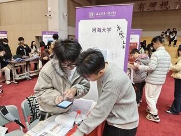 在学校体育馆举办的全国大学节活动中,来自全国各地的高校咨询台一字排开。澄澜载毅队成员身披河海大学宣传绶带,通过宣传手册、校园文创和精彩视频,向驻足咨询的学子全面介绍学校历史沿革、学科优势与校园文化。面对 “水利工程专业特色”“录取政策”“大学生活适应” 等疑问,队员们结合自身经历耐心解答,现场互动氛围热烈,让双十学子直观感受河海 “艰苦朴素,实事求是,严格要求,勇于探索” 的校训精神。