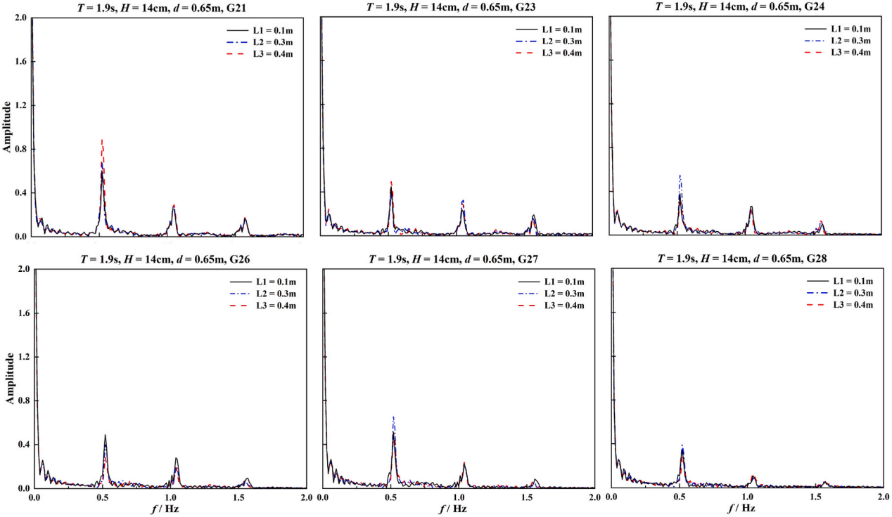 针对岛礁地形陡坡引发的波浪破碎及大尺度水面变形这一数值模拟难题,研究团队基于无网格粒子法(MPS)开发了高精度数值模型并经物理试验充分验证(图1)。依托该模型,研究揭示了波浪在礁坪潟湖地形上的传播演变规律。结果表明,波浪在传播至礁缘后会因地形突变发生显著变形与破碎,波高迅速衰减,并在后续传播过程中发生新的调整。与此同时,波浪破碎会强化高频成分,而在破碎后继续向潟湖传播的过程中,频谱能量逐步向低频响应倾斜(图2)。