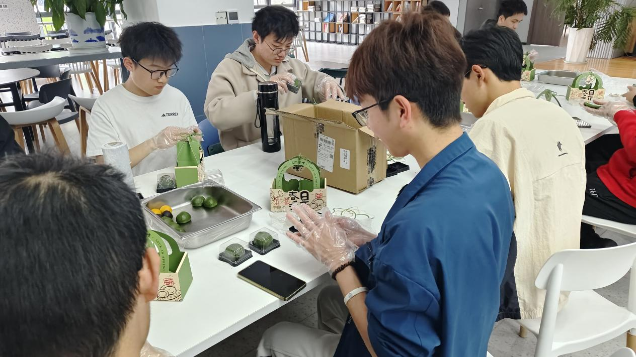 上午10点半,参与同学齐聚三食堂三楼,食堂工作人员提前备好青团食材、包装盒、手套等各类材料。活动正式开始后,同学们先动手折叠包装盒,搭配小挂件完成精美包装制作,随后开启青团手作环节。