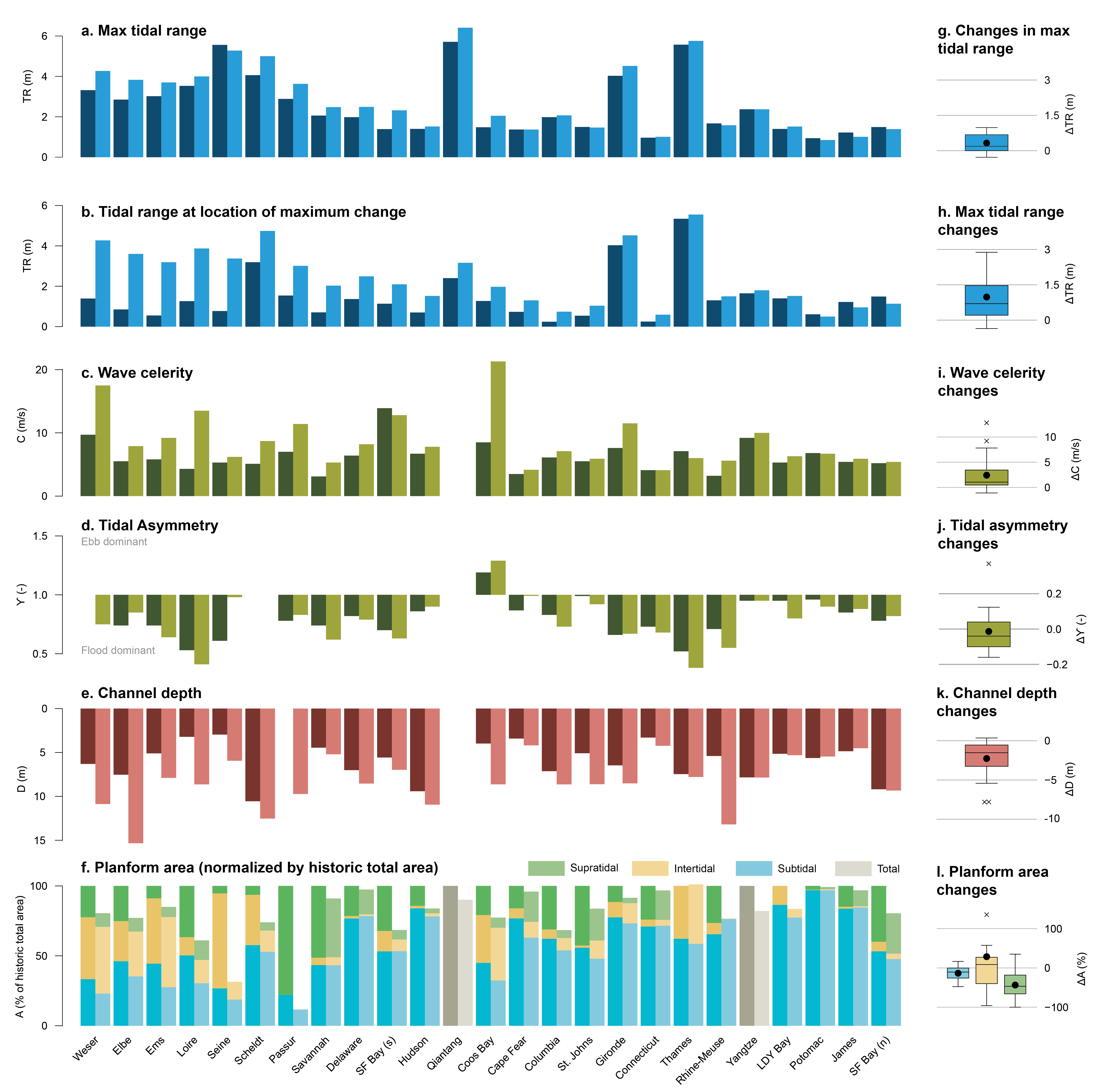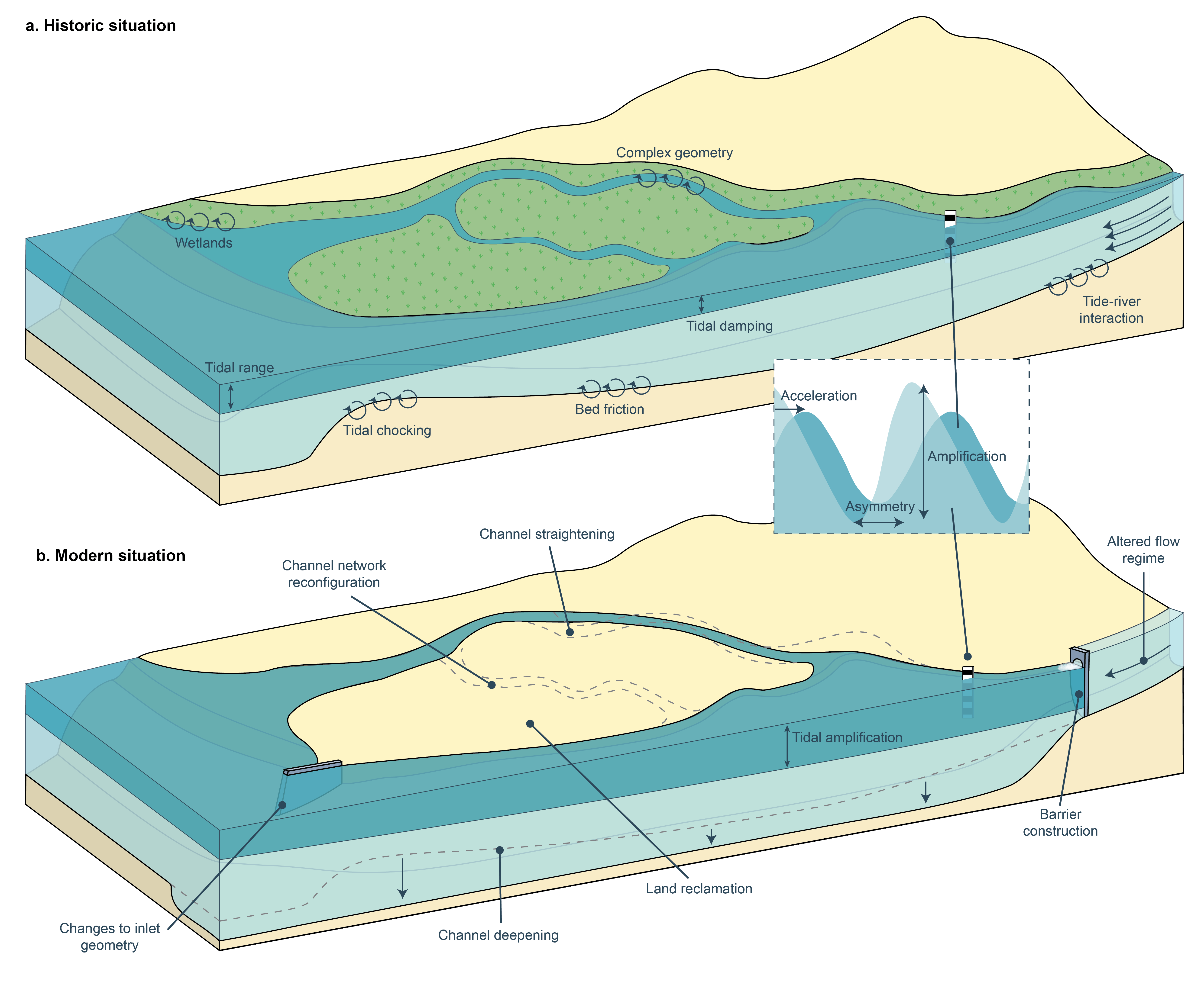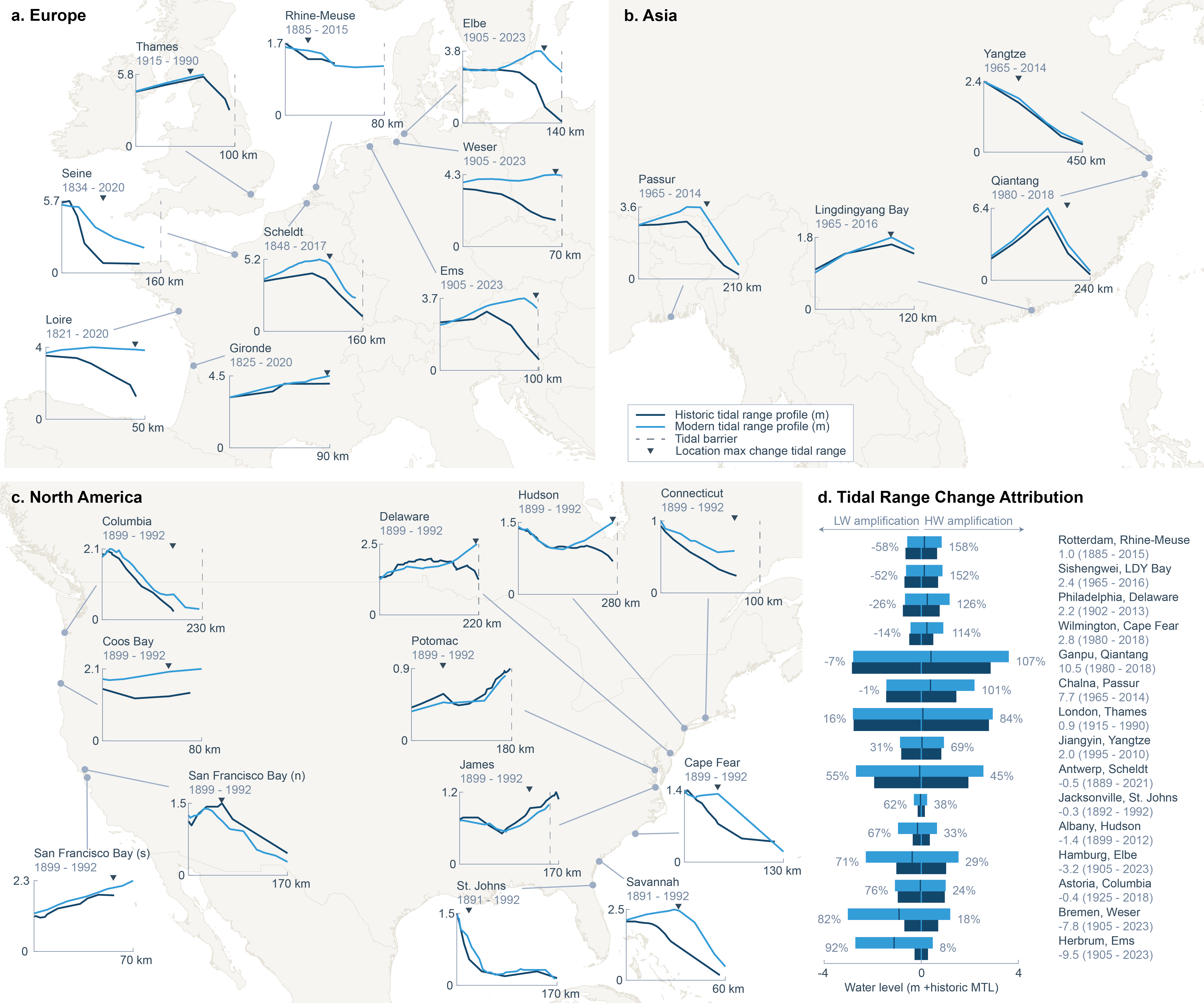 这项国际合作研究通过对比全球25个典型河口过去两个世纪的历史与现代观测数据,系统评估了局部人类活动与全球气候变化对河口潮汐动力的影响。研究发现,局部人为干预(如航道浚深、围海造陆等)已系统性地改变了全球河口的潮差、传播速度及不对称性。技术分析表明,全球范围内潮汐动力变化最显著的区域普遍位于距离海岸线100公里以上的内陆河段,而非仅限于河口近海区域。