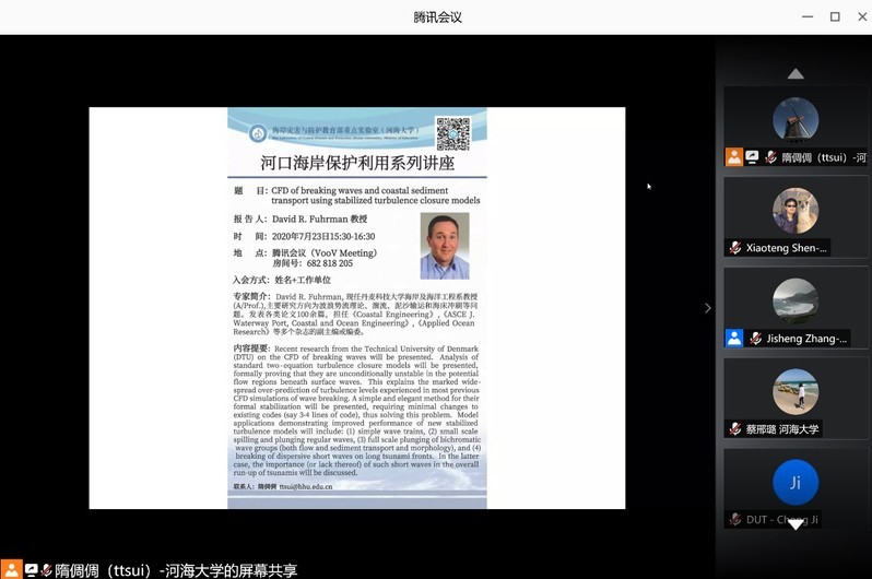 On July 23, 2020, the Key Laboratory of Ministry of Education of Coastal Disaster and Protection,organized the online academic exchange expert report meeting of Series Lectures on Protection and Utilization of Estuarine and Coast. Invited by Prof. Zheng jinhai, director of the Laboratory, Professor David R. Fuhrman of the technical university of Denmark, as the first report expert, gave an academic report entitled CFD of breaking waves and coastal dimensional transport using stabilized turbulence closure models. Vice dean Zhang Jisheng presided over the report meeting.